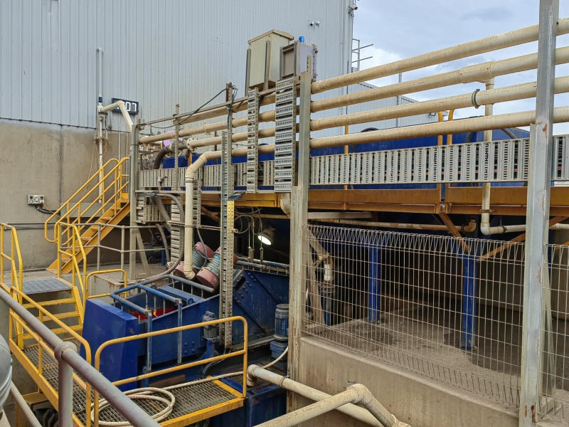 通過(guò)大型收集漏斗能夠同時(shí)收集兩輛真空開(kāi)挖卡車(chē)進(jìn)行傾倒,再通過(guò)閥門(mén)調(diào)整進(jìn)入大型振動(dòng)篩的供料量。該礦用振動(dòng)篩是用于一級(jí)篩分處理,分離大于2mm的大顆粒物,處理后再進(jìn)入精細(xì)振動(dòng)篩單元(包括雙層精細(xì)分離振動(dòng)篩和除泥器)。