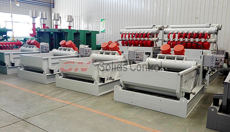 1500gpm泥漿系統包含以下項目: 1)3臺500gpm處理量的振動篩,型號為:gnzs703e-dz,總處理量為1500gpm 2)1臺處理量為1500gpm的泥漿清潔器,型號為:gnzj703e-3s16n 3)1個帶振動篩和泥漿清潔器的泥漿回收罐 4)1個帶泥漿攪拌器,泥漿槍的儲漿罐,用于儲存和混合泥漿。