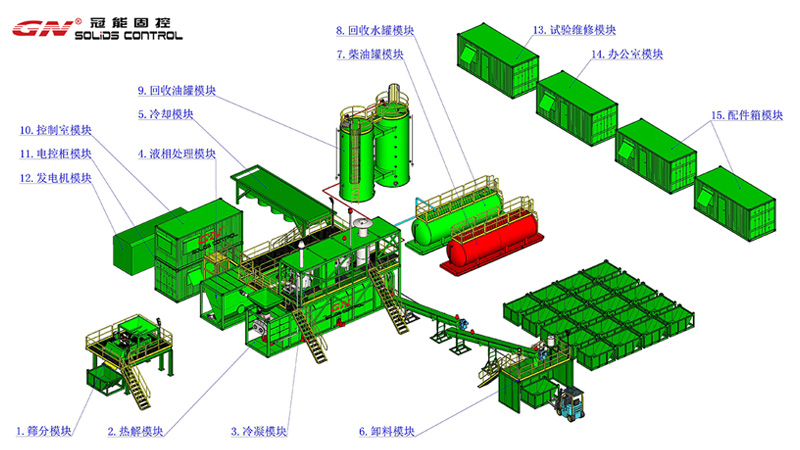 主要模塊單元 篩分模塊、熱解模塊、冷凝模塊、液相處理模塊、冷卻塔模塊、卸料模塊、柴油罐模塊、